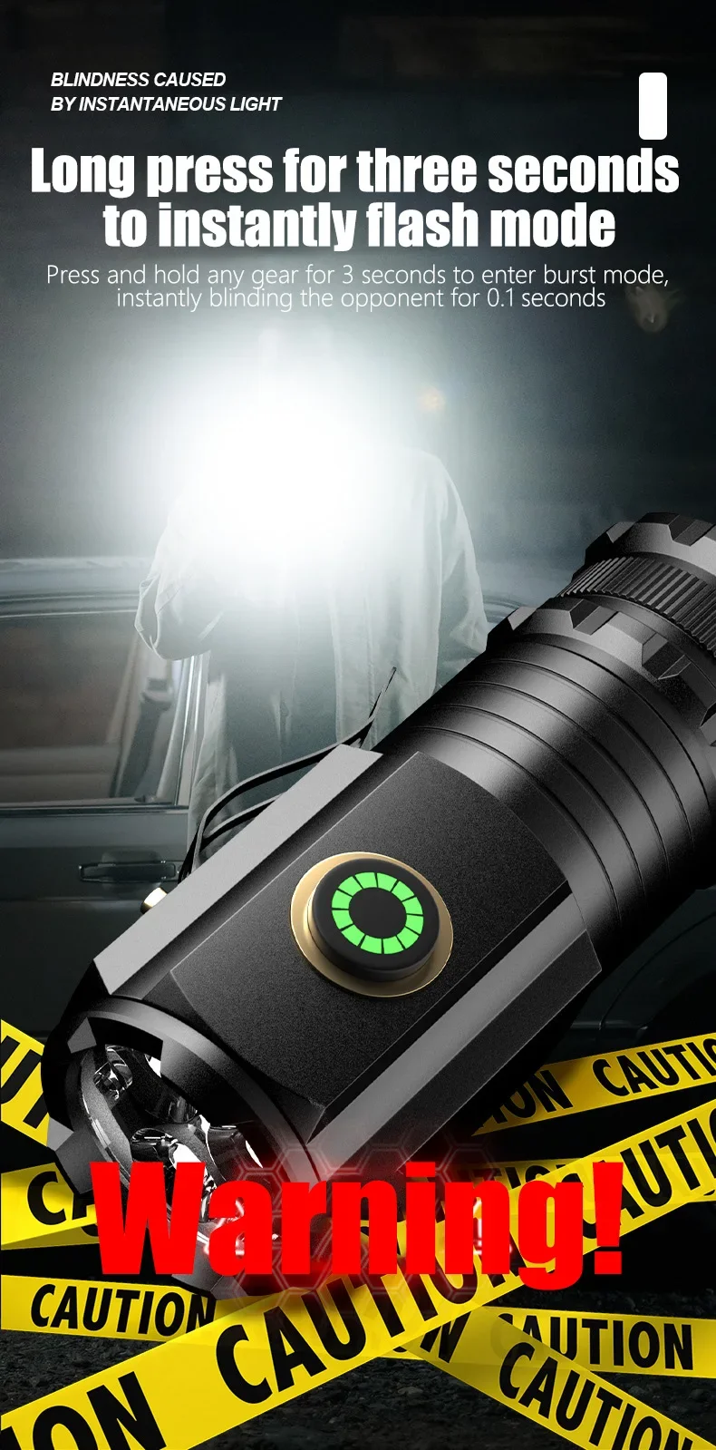 Strong light – Medium light – Weak light – Double click to enter TURBO Modes-SOS