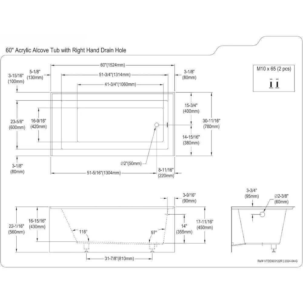 - Product dimensions – 30-11/16″ W x 60″ L x 22-1/6″ H | Water depth – 14″ to overflow | Tub capacity – 58.2 gallon | Weight – 95 lbs.