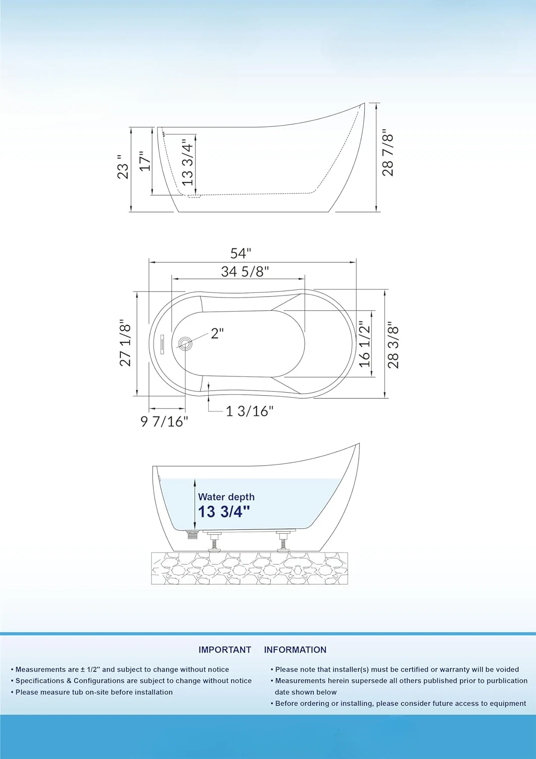 - DIMENSIONS AND SPECIFICATIONS: Exterior Dimension: 54″ Long x 28 3/8″ Wide x 28 7/8″ Deep – Effective Tub Capacity: 55 Gallons