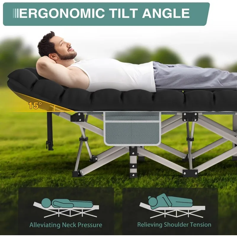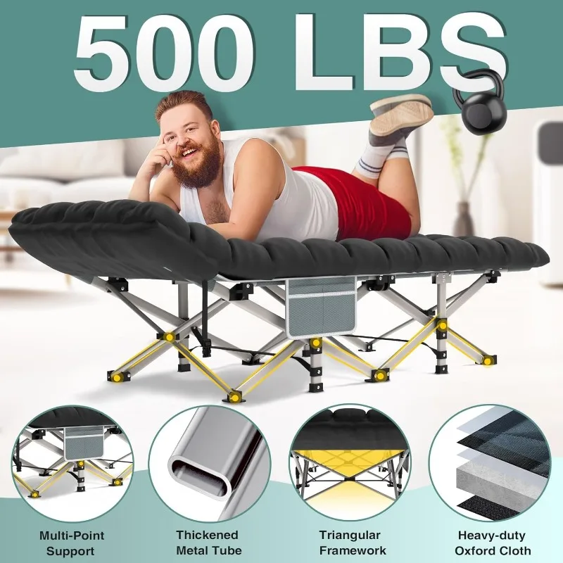 【Sturdy and Stable】Feel confident resting on a camping cot bed designed to support up to 500 lbs. The enhanced structure boasts 10 tubular iron legs with 25 mm thick flat round square tubes, ensuring uniform force distribution for a stronger, more stable sleep. The non-slip nubs keep the cot secure on any terrain, ensuring a safe, worry-free slumber under the stars.