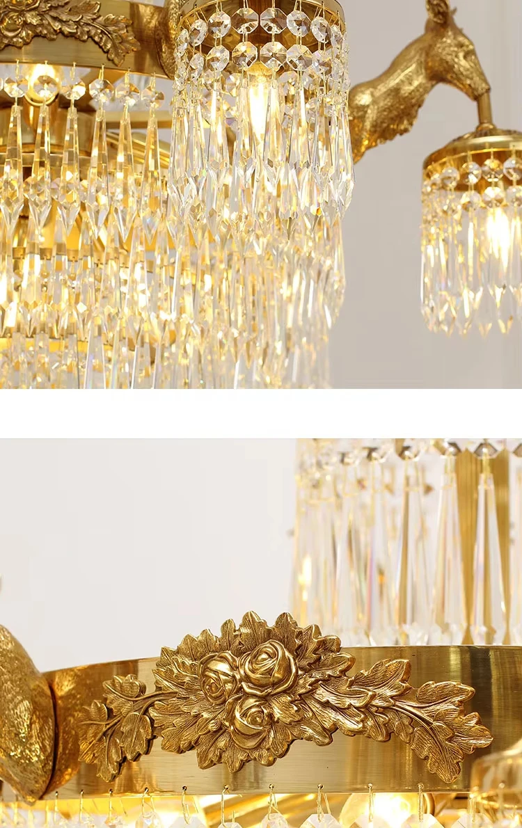 European rococo style full brass lamp k9 crystal shade deer antler fish chandelier centerpieces