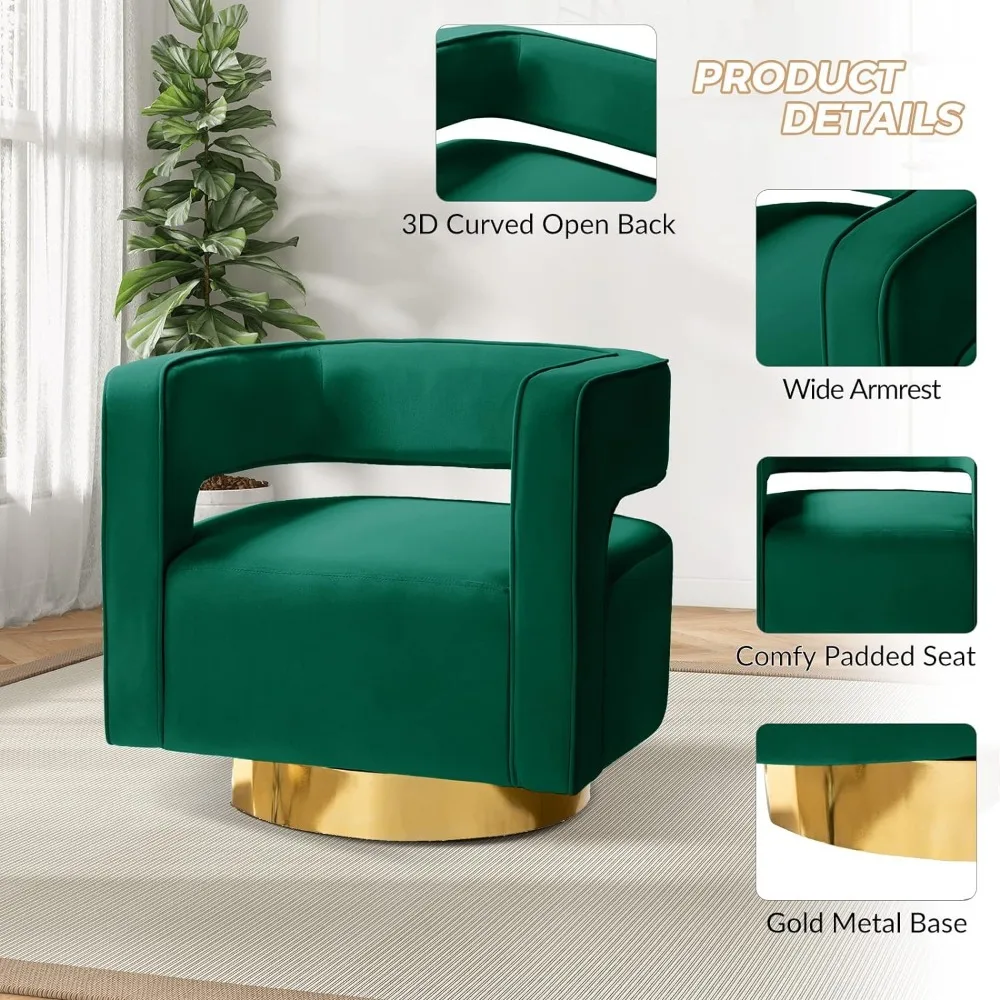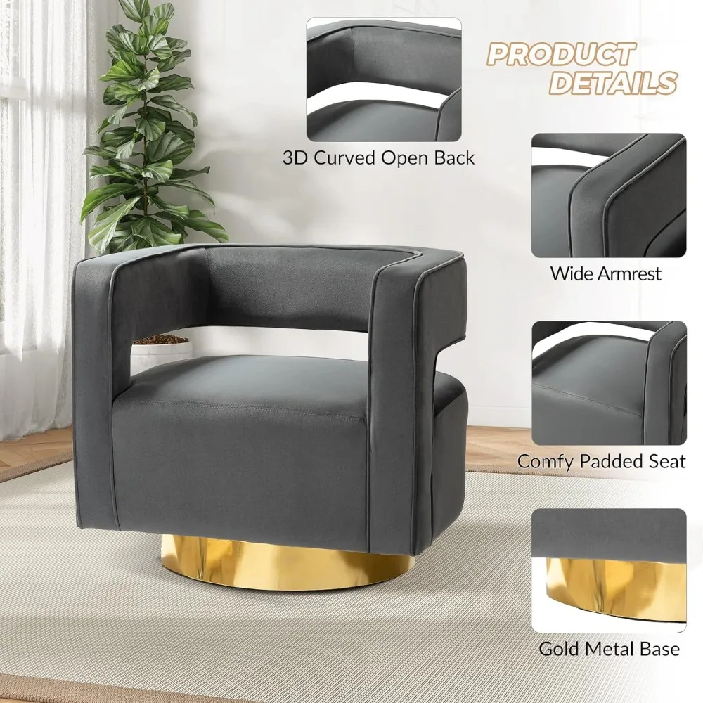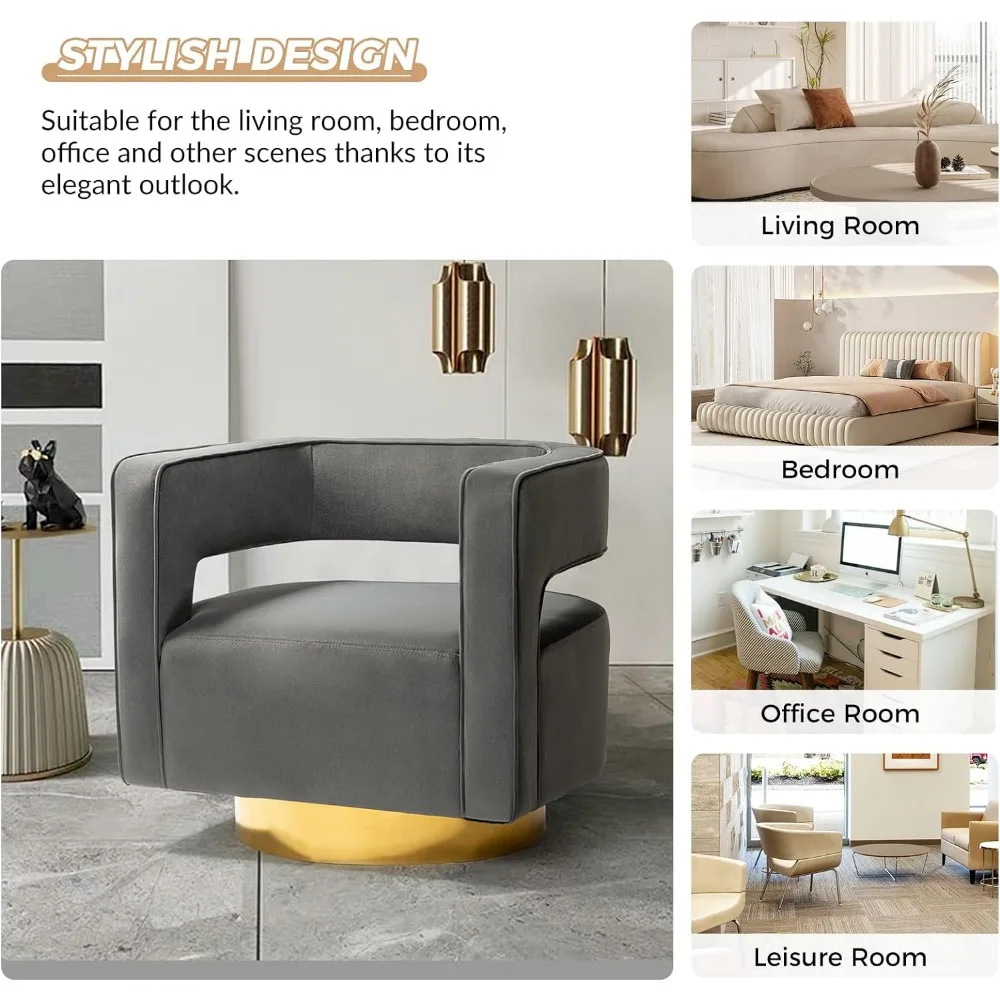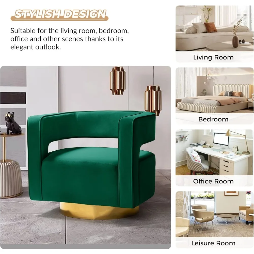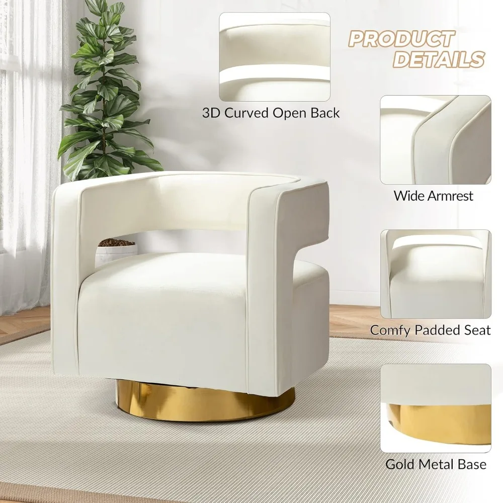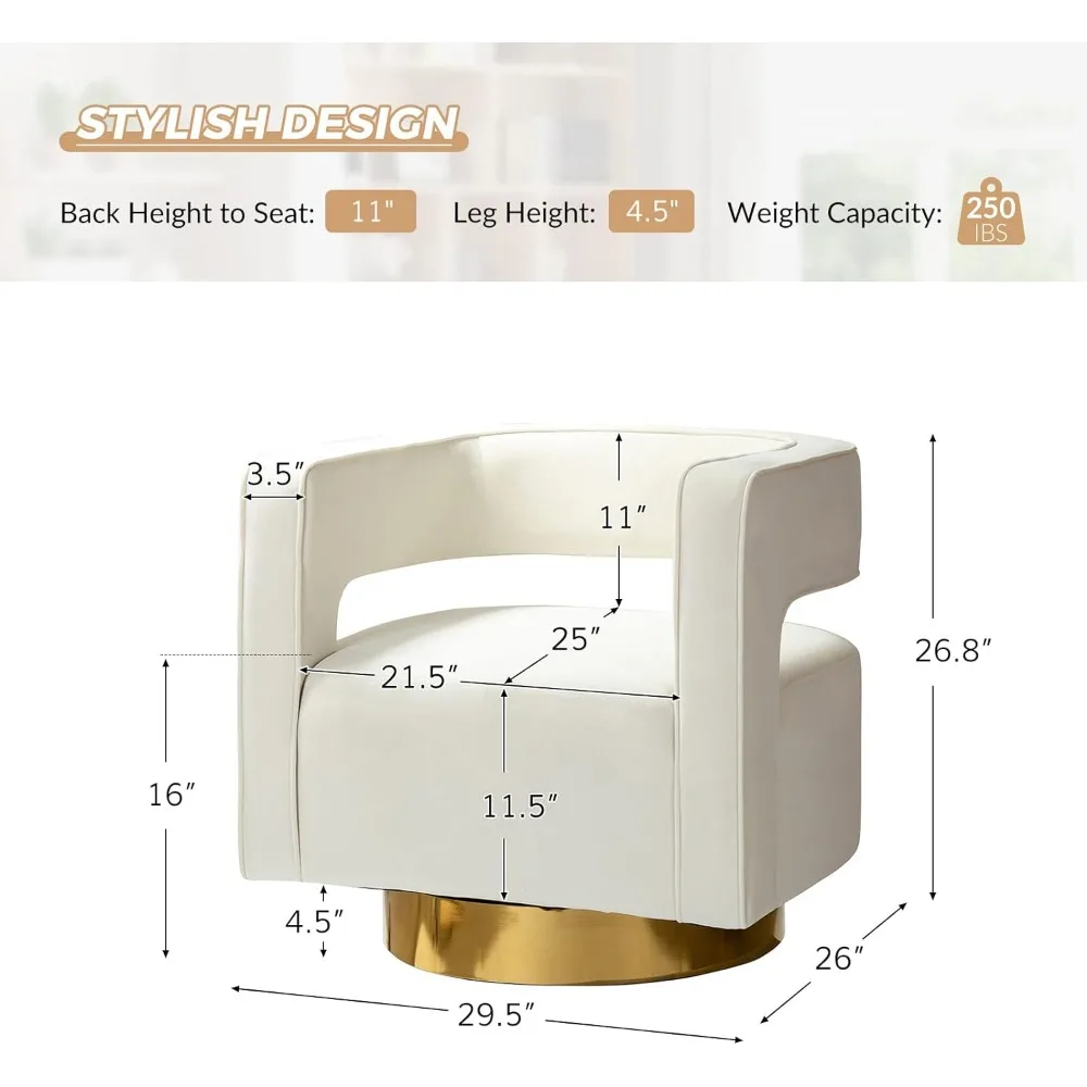 - ?【Contemporary & Classic style】This 3D barrel swivel chair comes with an elegant appearance, and the unique curved open back matches with a gold metal swivel base, This comfy addition to your living space also provides an elegant, inviting decor.