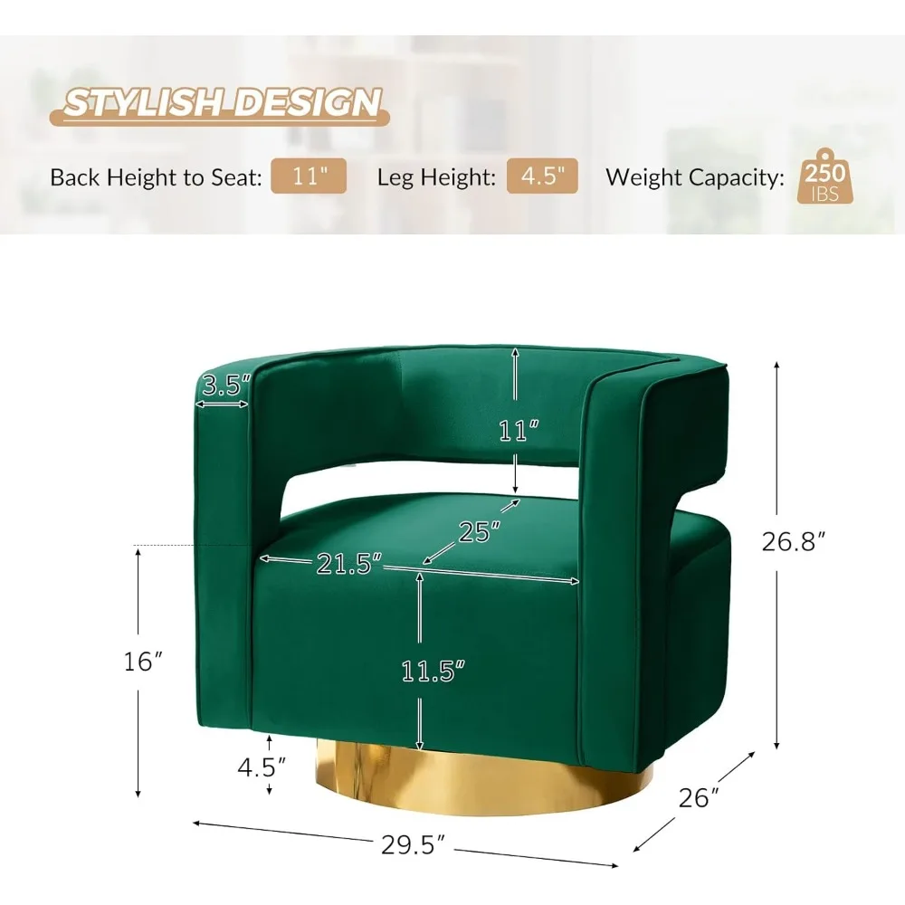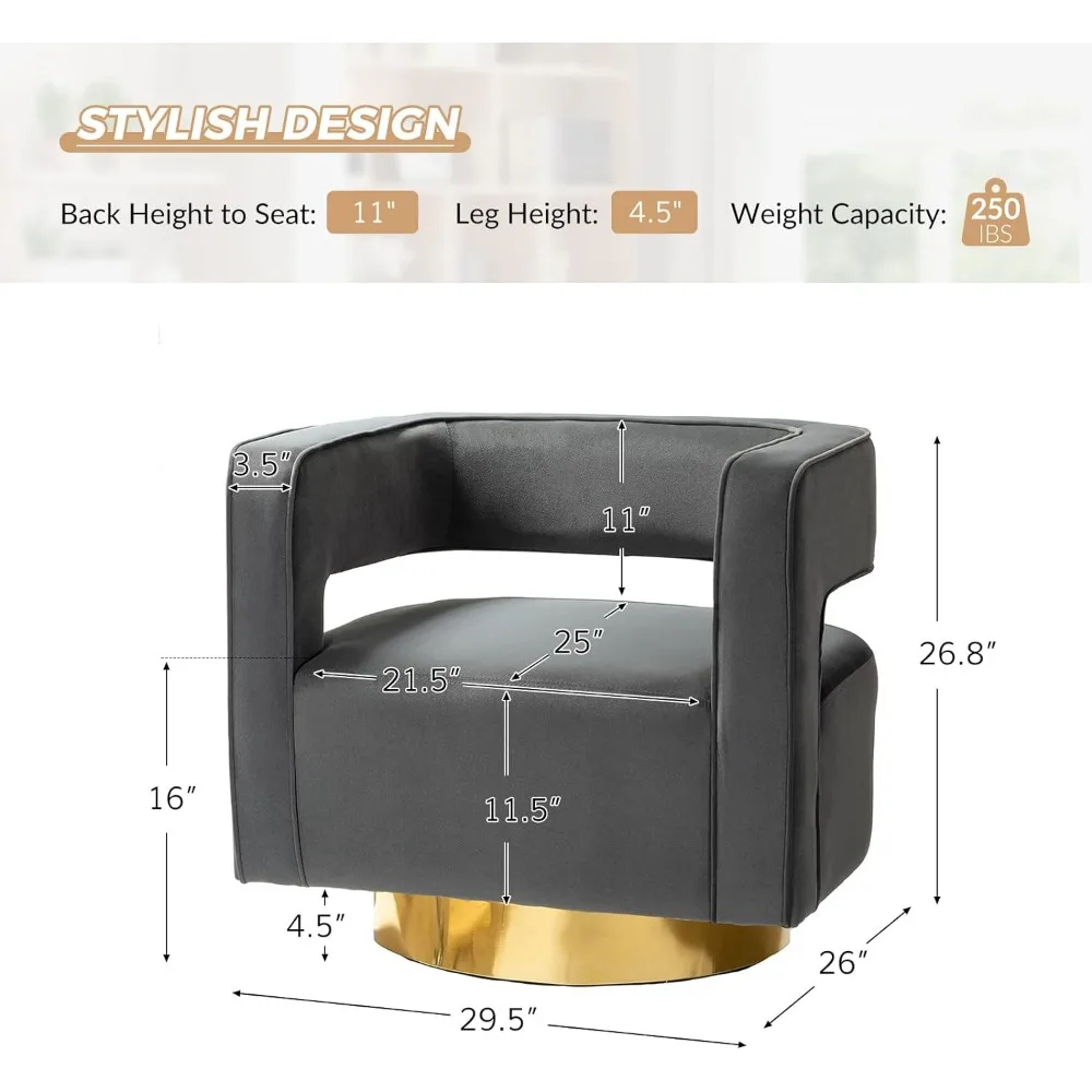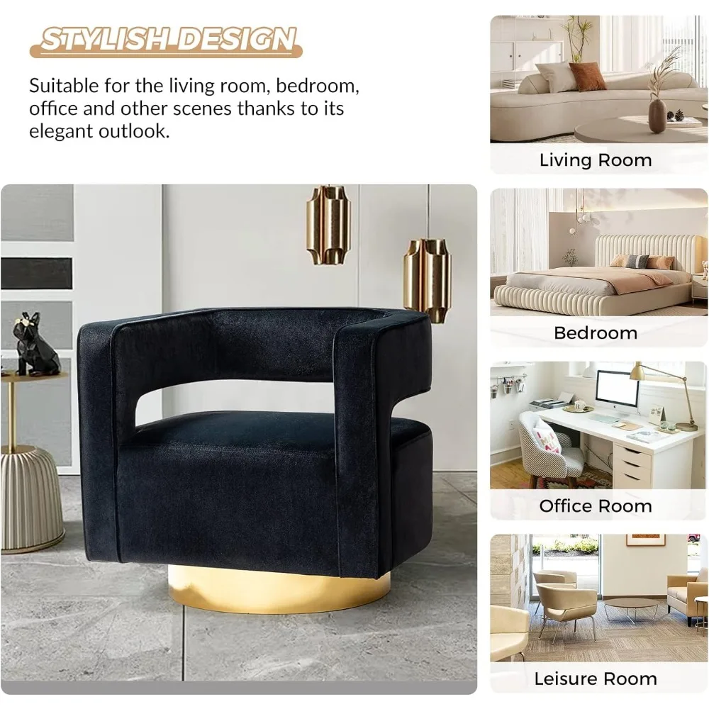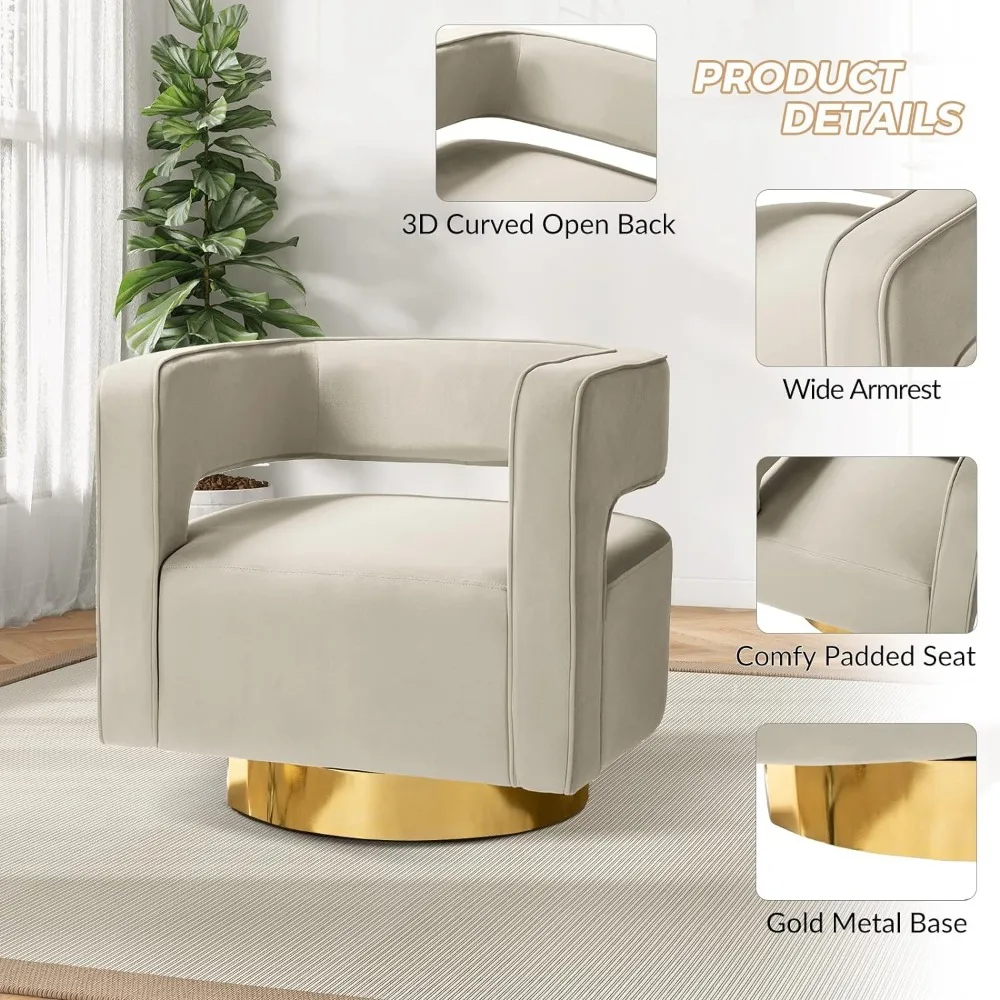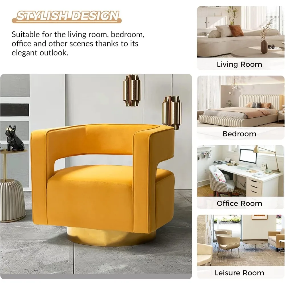- ?【Contemporary & Classic style】This 3D barrel swivel chair comes with an elegant appearance, and the unique curved open back matches with a gold metal swivel base, This comfy addition to your living space also provides an elegant, inviting decor.