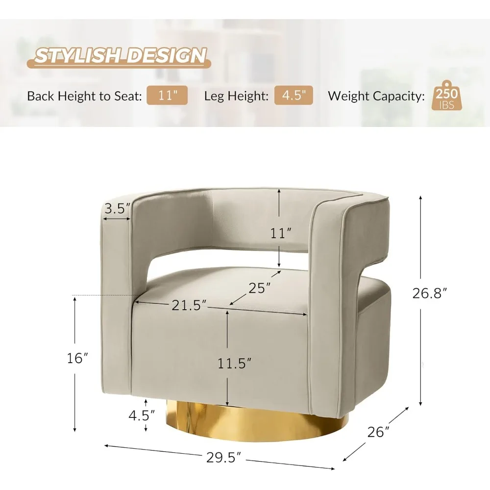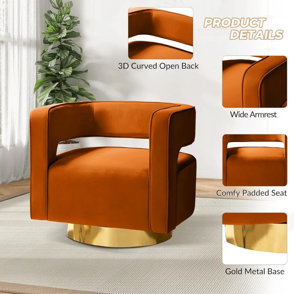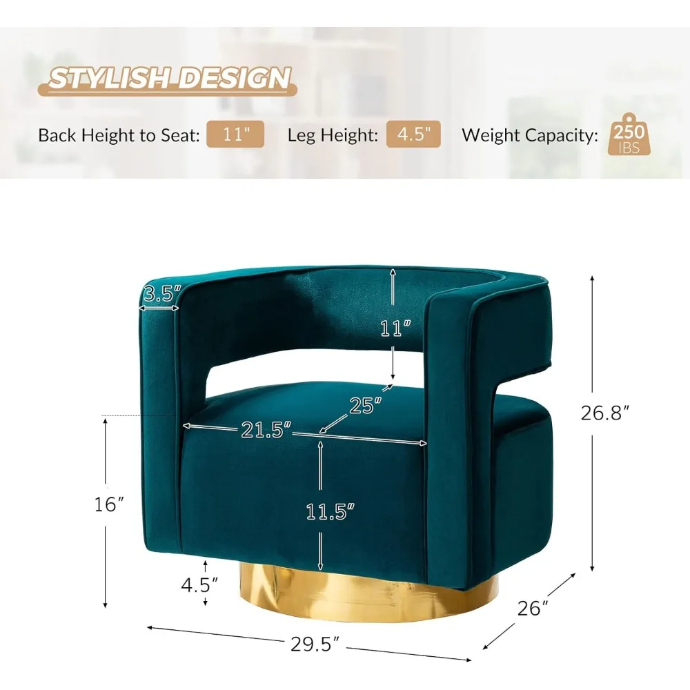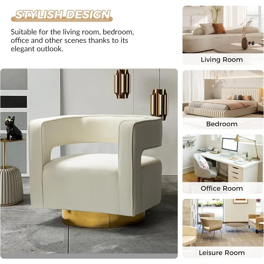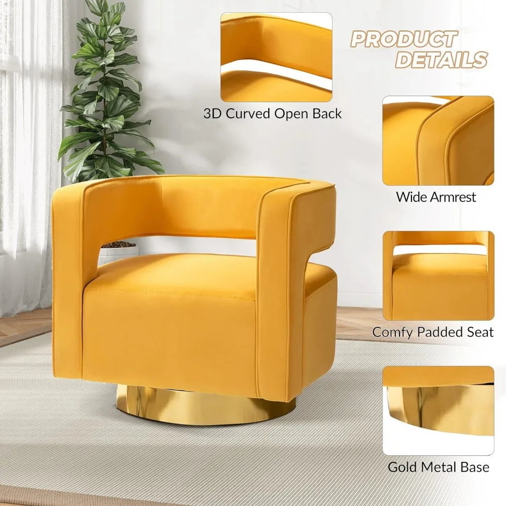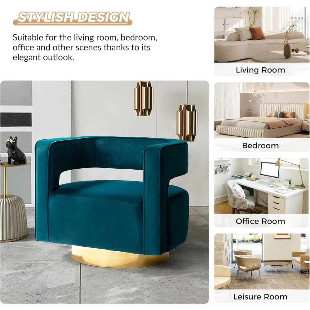 - ?【Contemporary & Classic style】This 3D barrel swivel chair comes with an elegant appearance, and the unique curved open back matches with a gold metal swivel base, This comfy addition to your living space also provides an elegant, inviting decor.