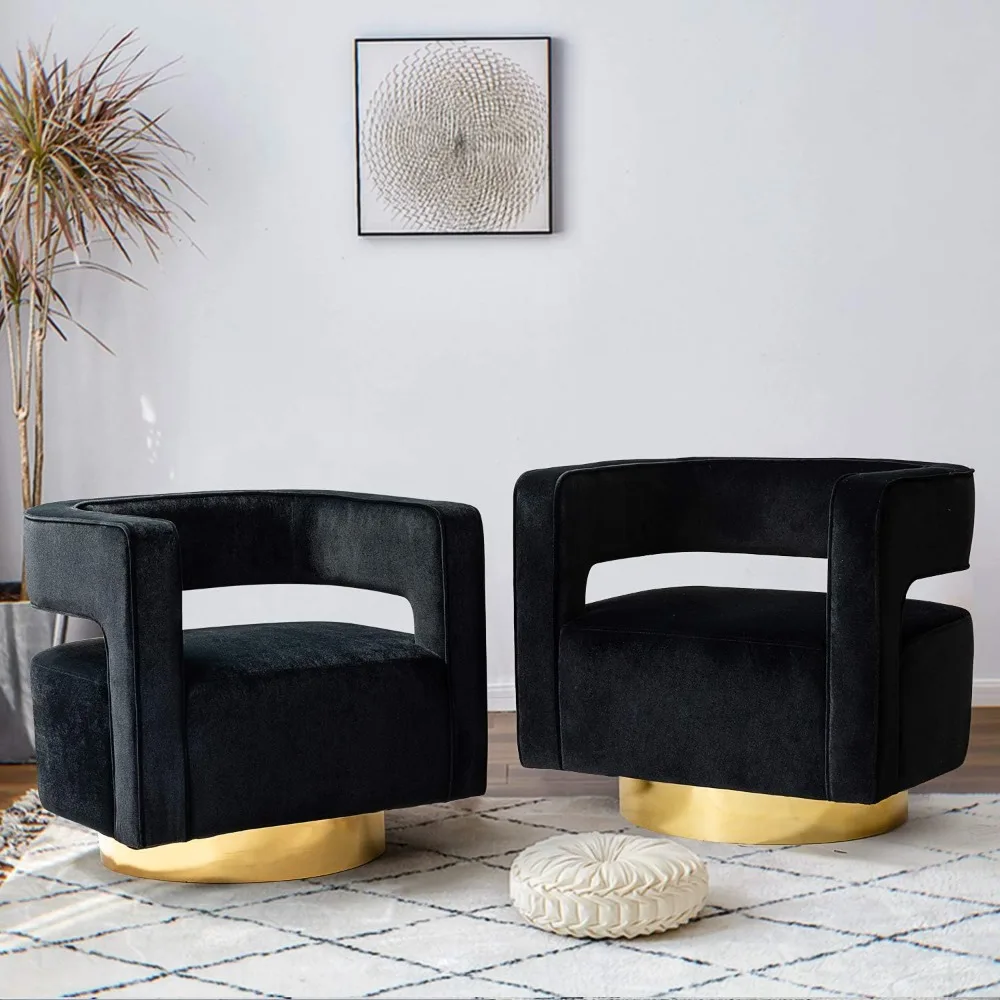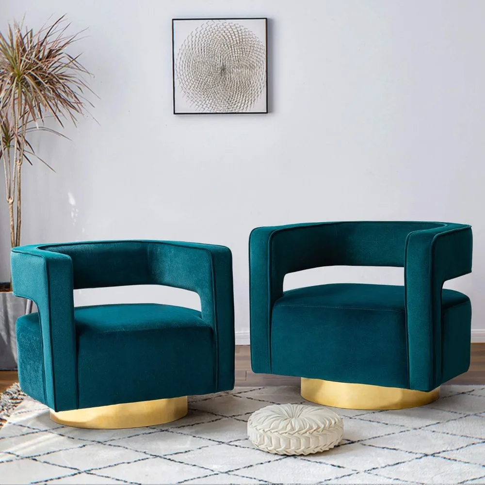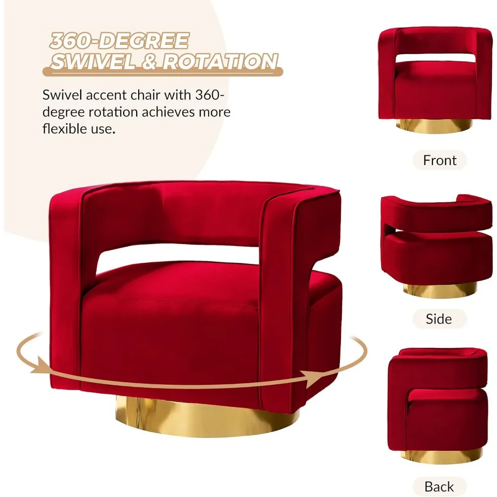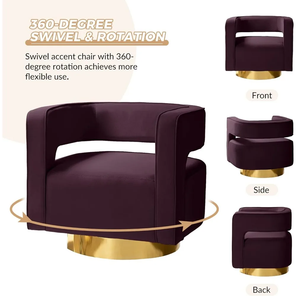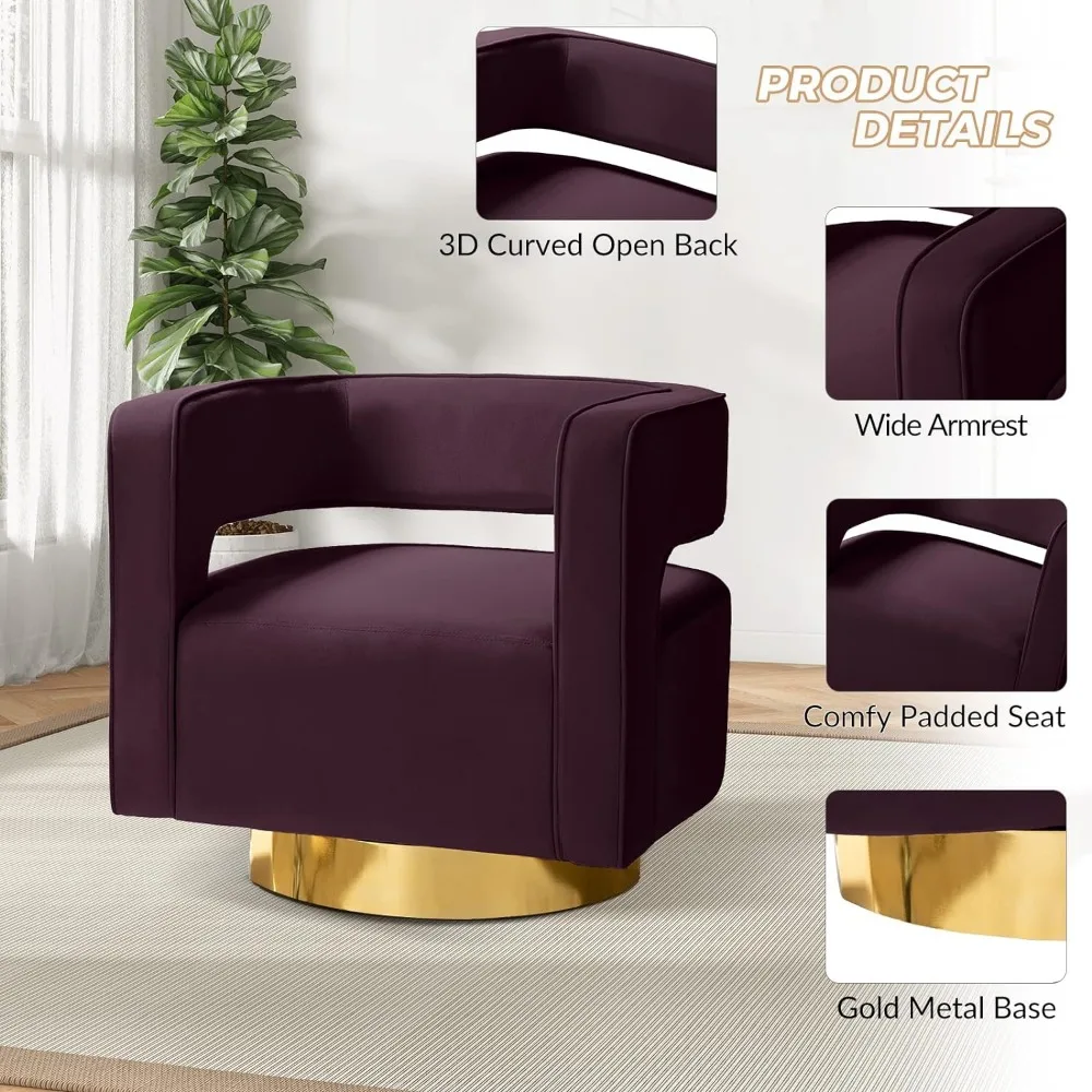 - ?【Contemporary & Classic style】This 3D barrel swivel chair comes with an elegant appearance, and the unique curved open back matches with a gold metal swivel base, This comfy addition to your living space also provides an elegant, inviting decor.