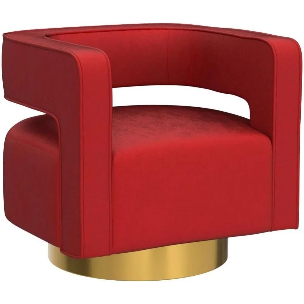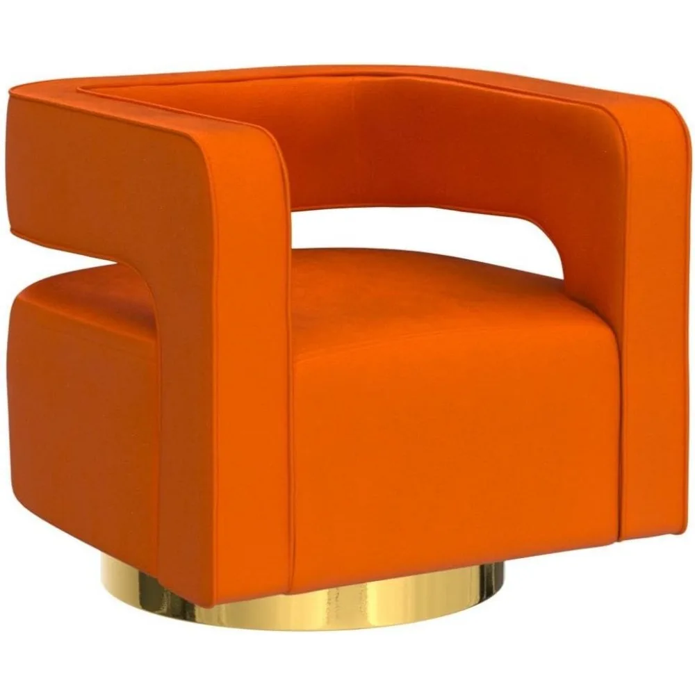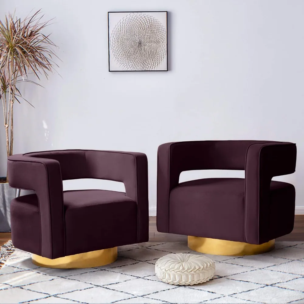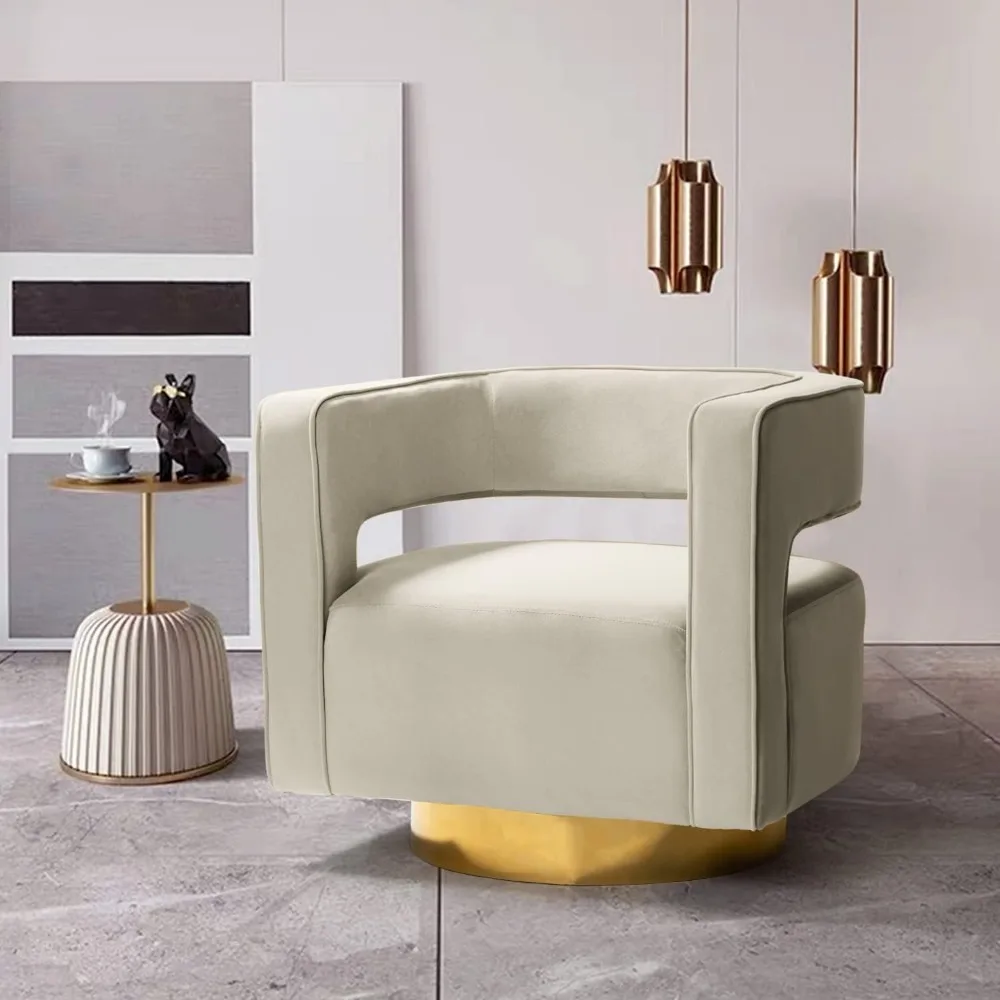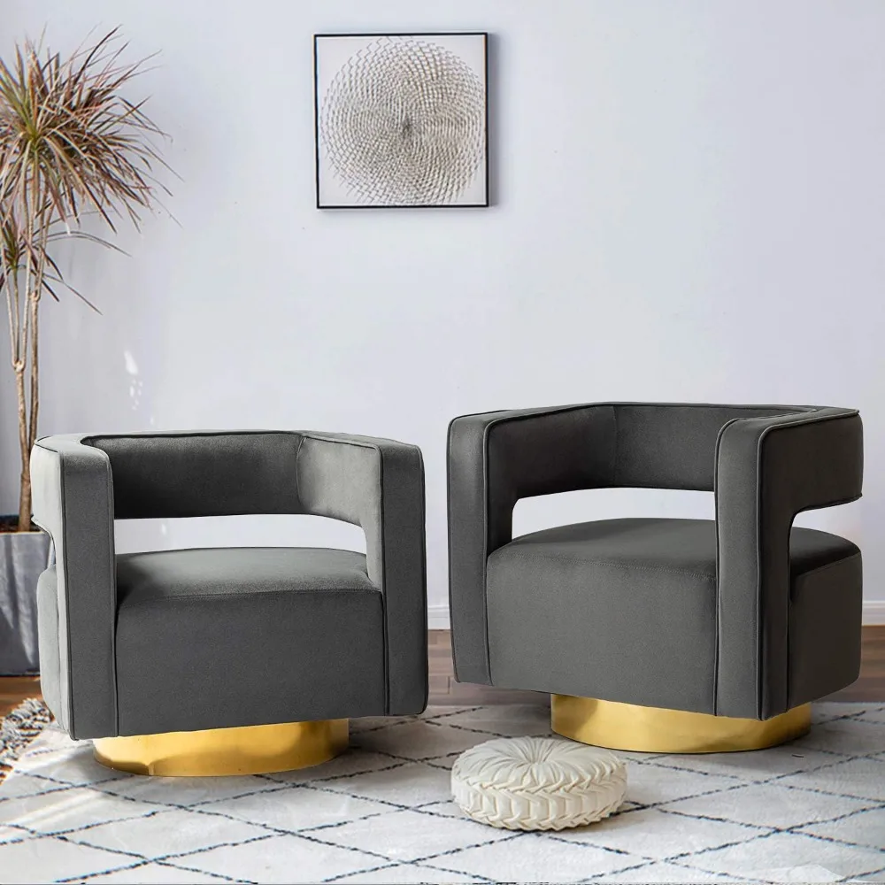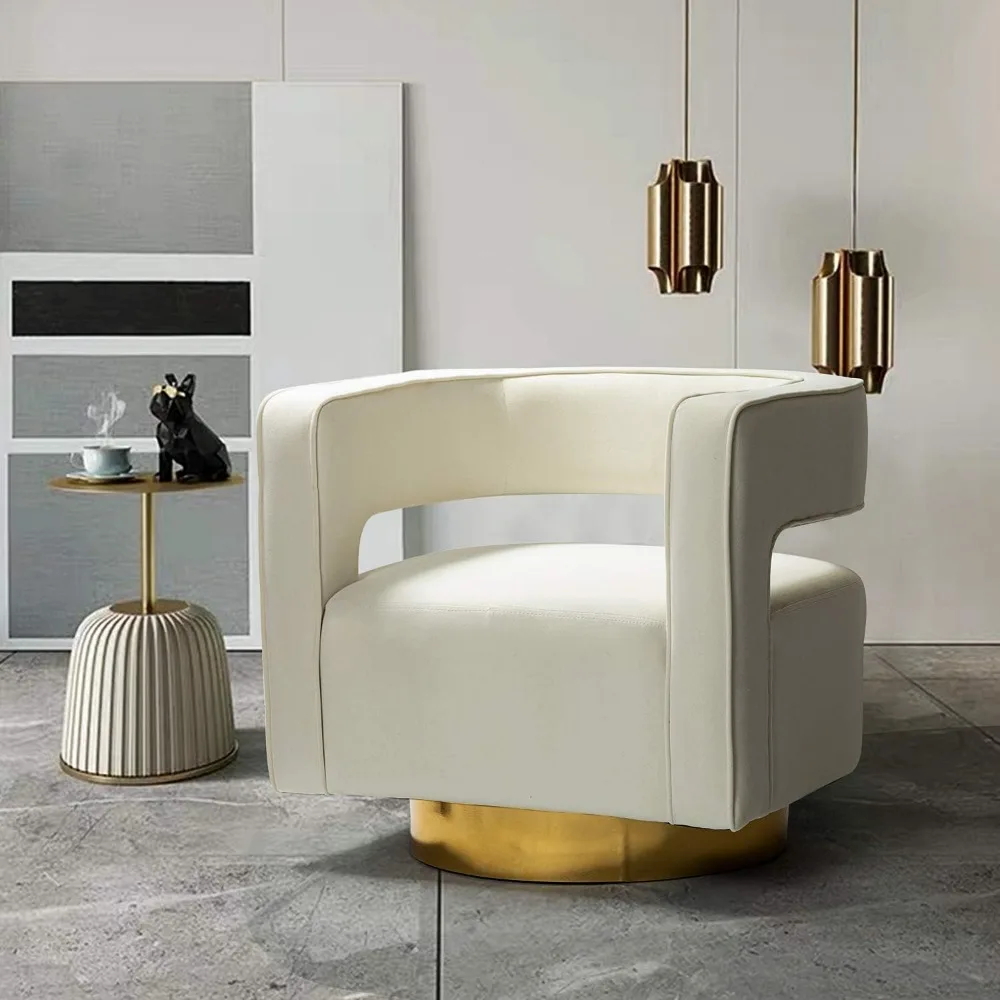 - ?【Contemporary & Classic style】This 3D barrel swivel chair comes with an elegant appearance, and the unique curved open back matches with a gold metal swivel base, This comfy addition to your living space also provides an elegant, inviting decor.