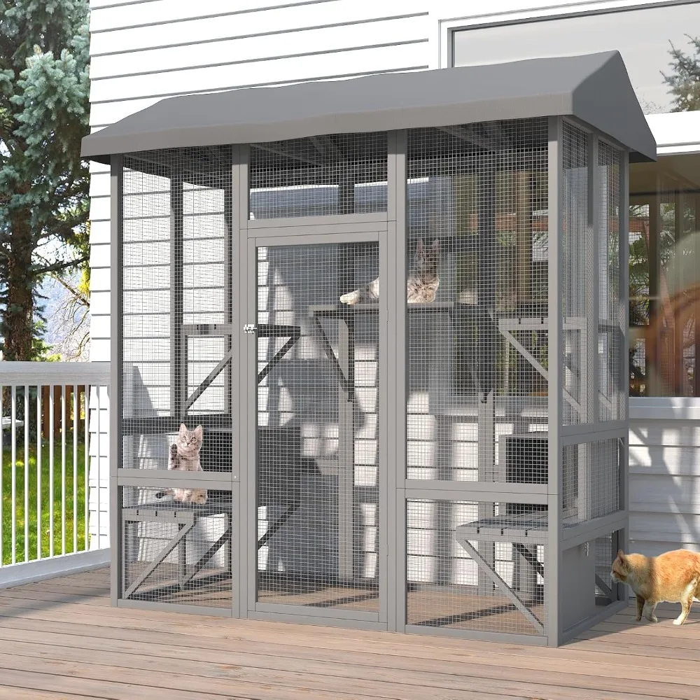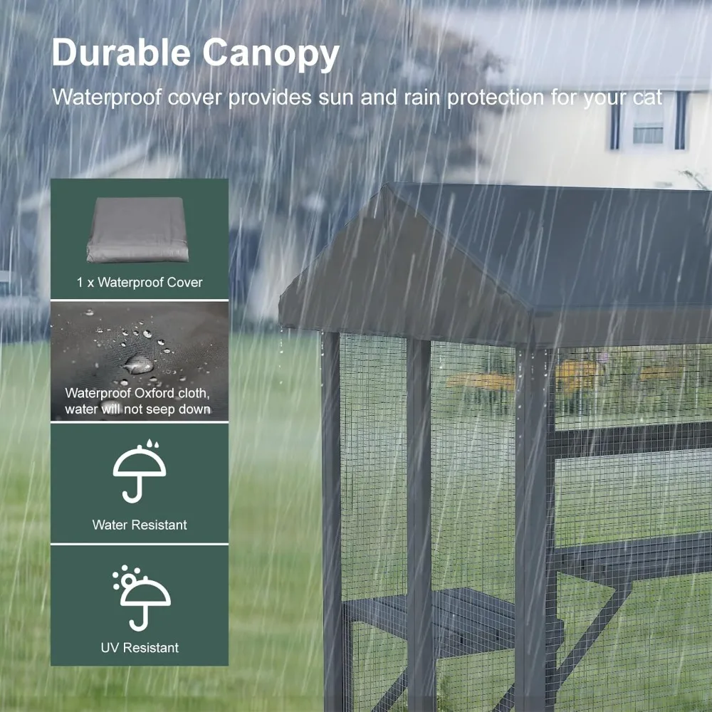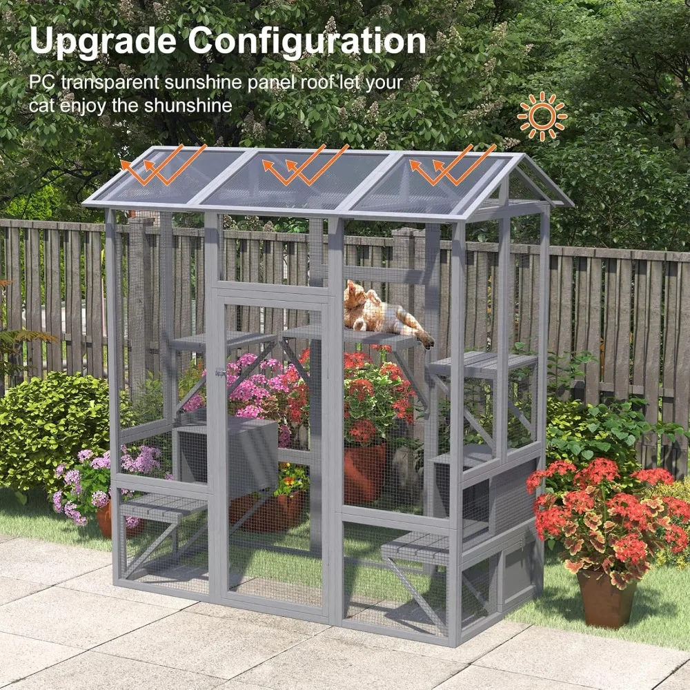 - 【Comfy with Sun Panel Roof】Unlike traditional asphalt roof, our cat enclosure use transparent sunshine sloping roof, allows your cat to soak up the sun and shelter cats from rain. If you still worry about the water, you can use our waterproof cannopy.