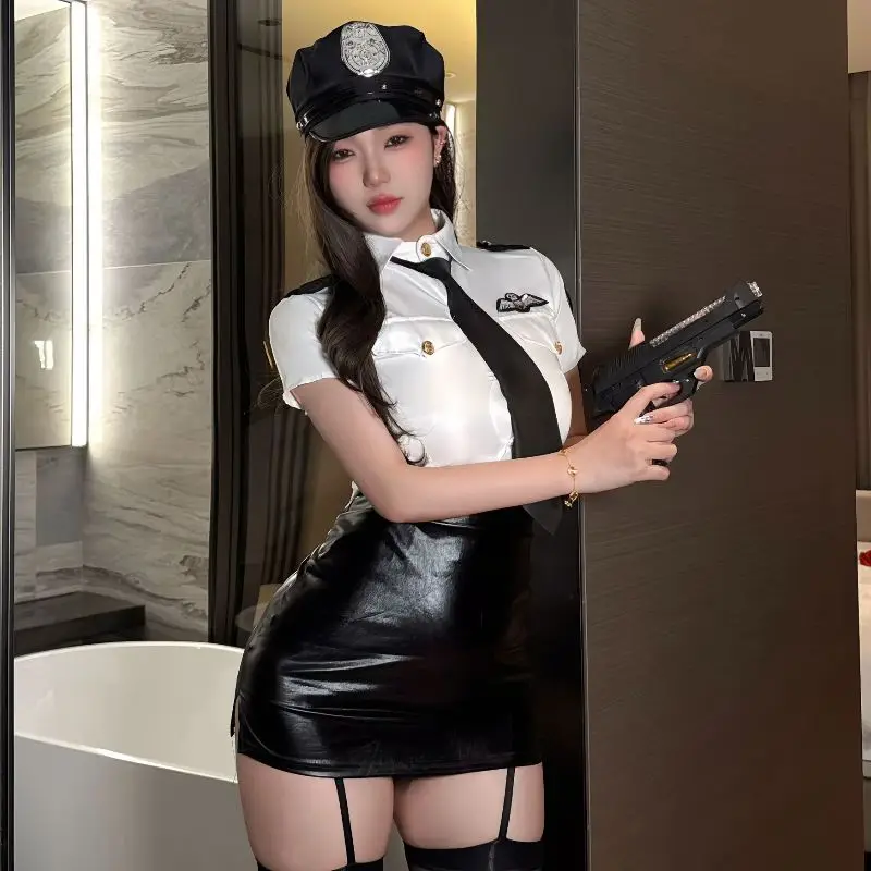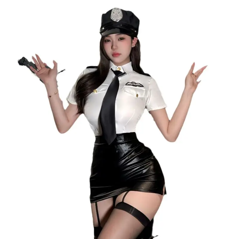 Sexy Lingerie Police Uniform Collocation Solid Color Shirt Adorn Leather Wrapped Hip Dress Necktie Black Suspenders Police Hat