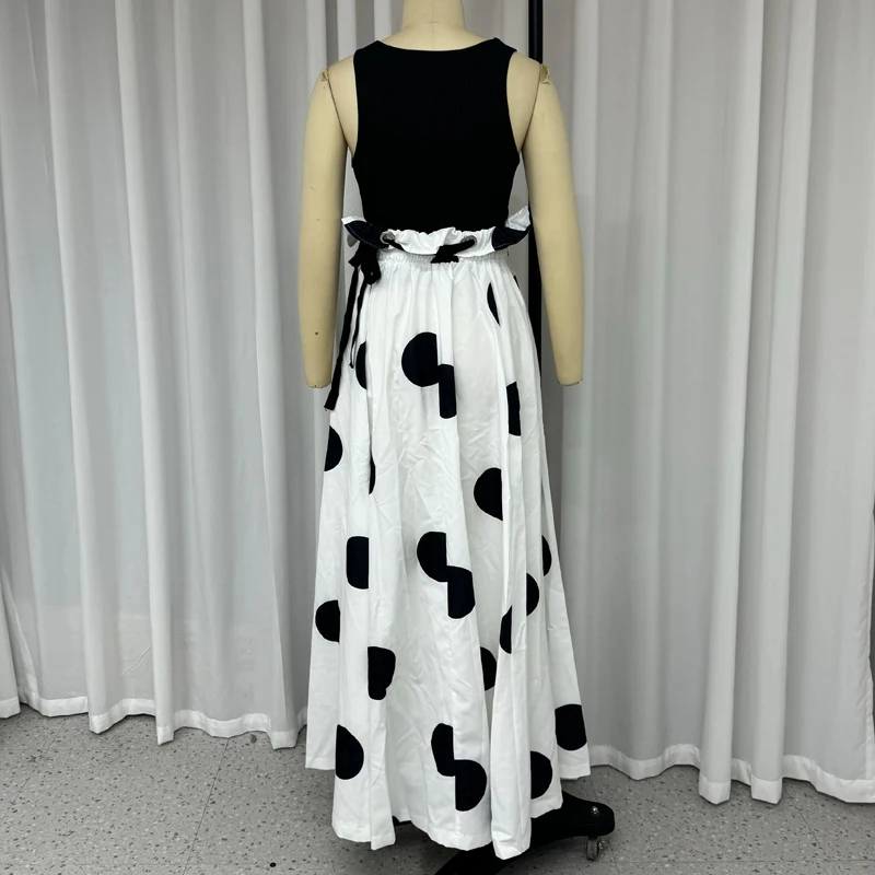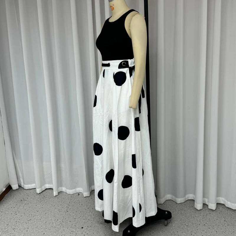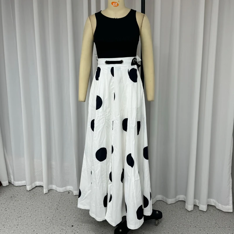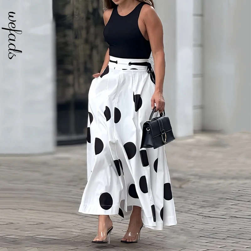 Wefads 2024 Two Piece Set Women Summer Office Chic Solid Sleeveless Round Neck Vest Top Loose Polka Dot Printed Long Skirt Sets