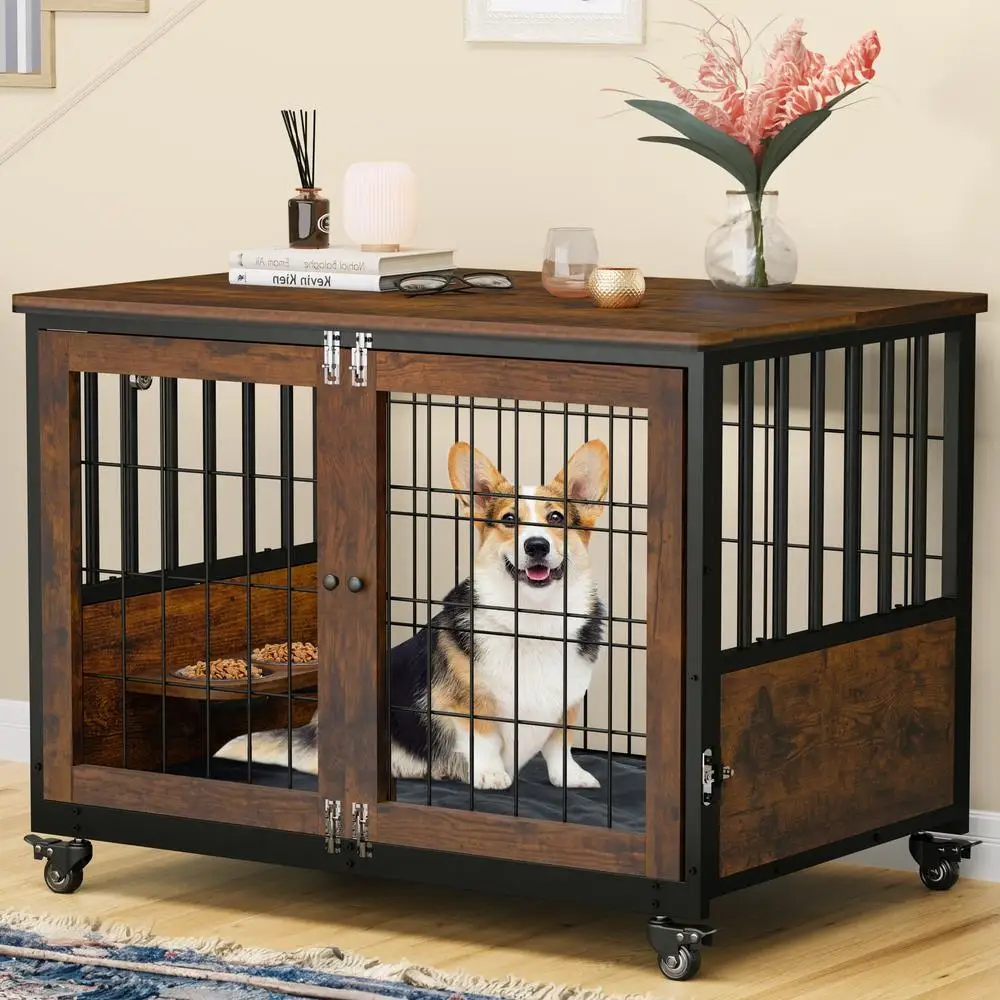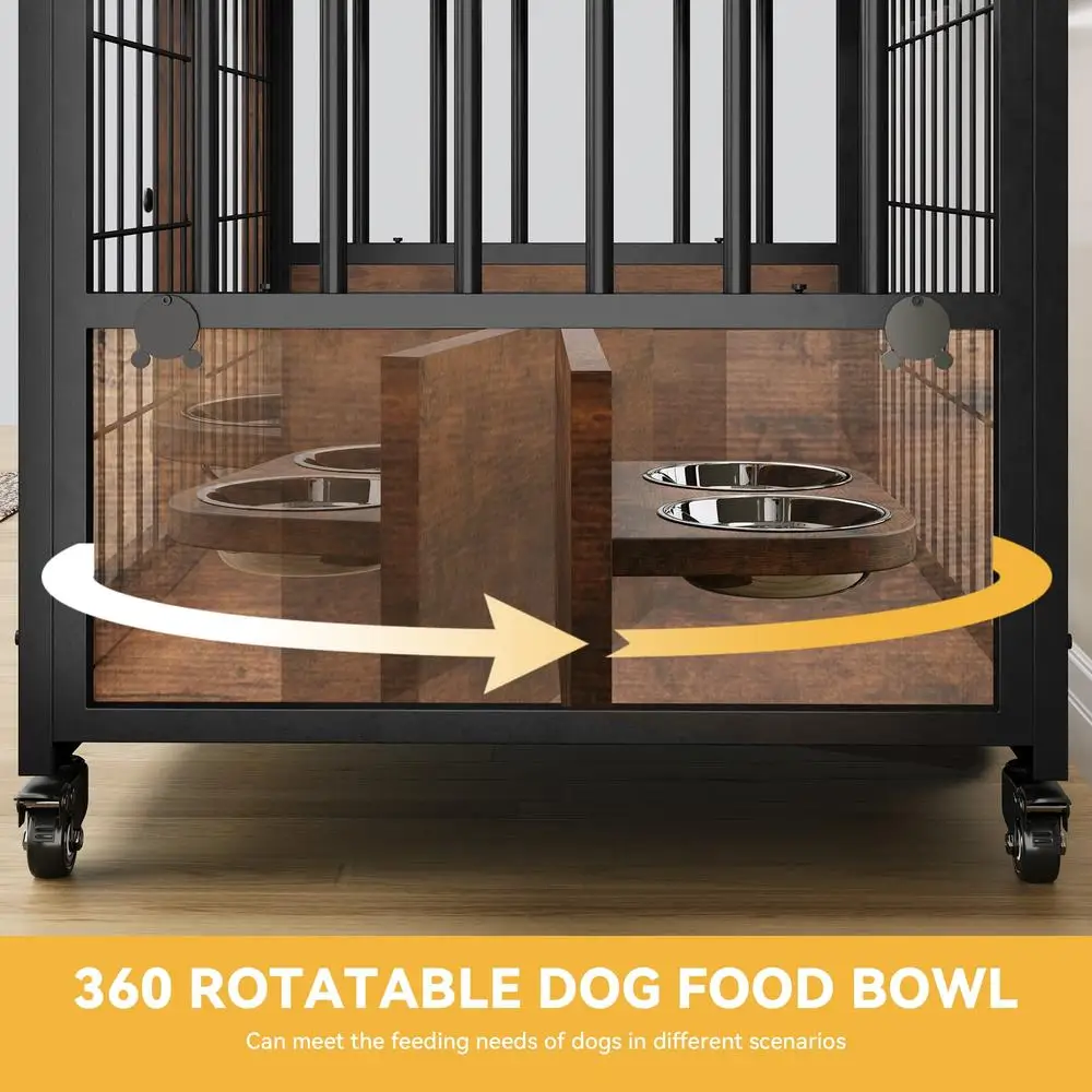 2 swirling bowls make the pet feeding convenient. Strong and Durable: Features sufficient ventilation space to provide a longer service life; Compared to traditional dog cages, this is safer, more stable, comfortable, and aesthetically pleasing; Easy to Move:4 360-degree casters with brakes allow you to move it from one place to another. Double Room Design: Our 2-in-1 dog cage coffee table has a partition in the middle to accommodate 2 small to medium dogs, giving each dog its own space; 3 ways of exit from the front, side, and top;Made of P2-manufactured wood, it is safer and more scratch-resistant.
